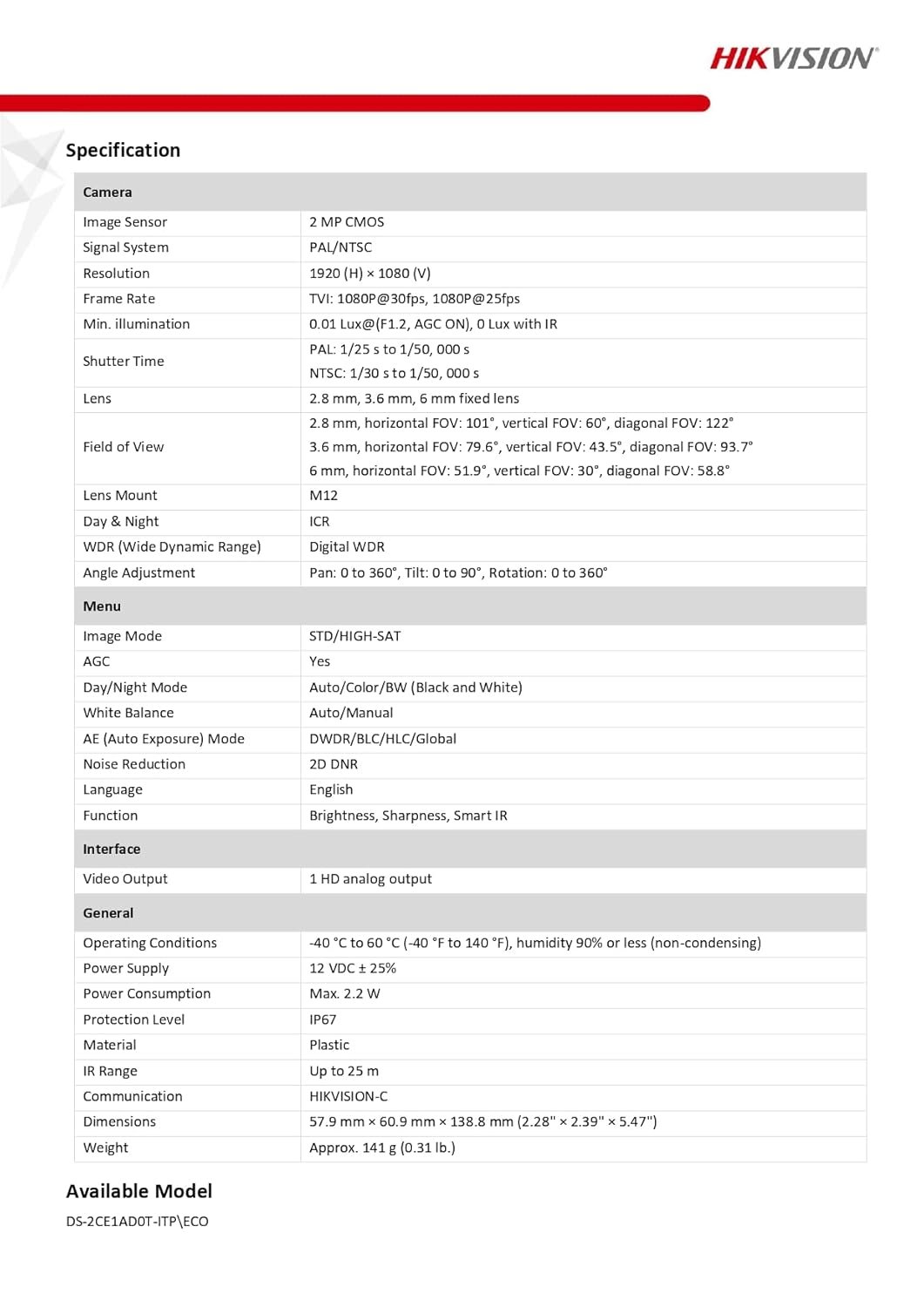 HIKVISION 2Mp Indoor Wired Color Camera for Dvr Ds-2Ce5Ad0T-Itp Eco Bnc/Dc, White - 1080P